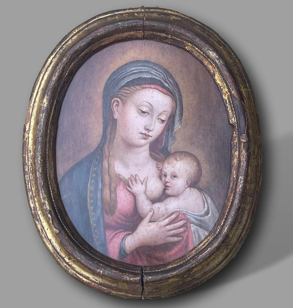 Superbe huile sur panneau représentant une Vierge à l’Enfant allaitant (Madonna lactans), thème emblématique de la Renaissance italienne.