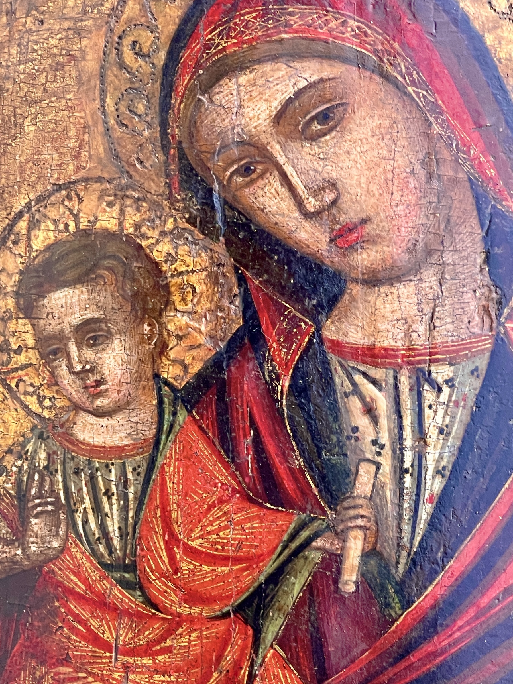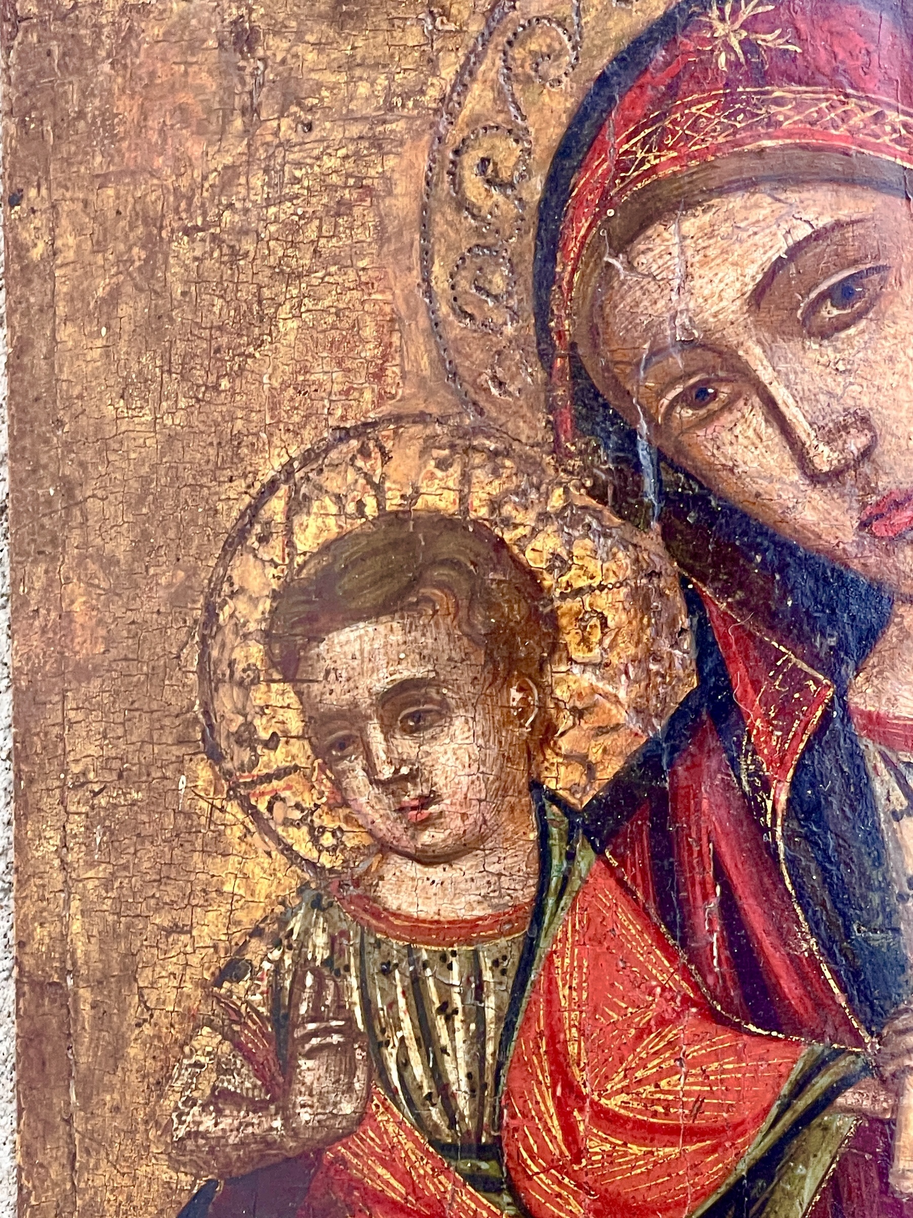 Le fond doré, orné de délicats motifs gravés aujourd’hui atténués par le temps, renforce le caractère sacré de la scène. La palette chromatique, dominée par les rouges profonds, les ors patinés et les ombres brunes, crée une atmosphère chaleureuse, mystique et profondément humaine.