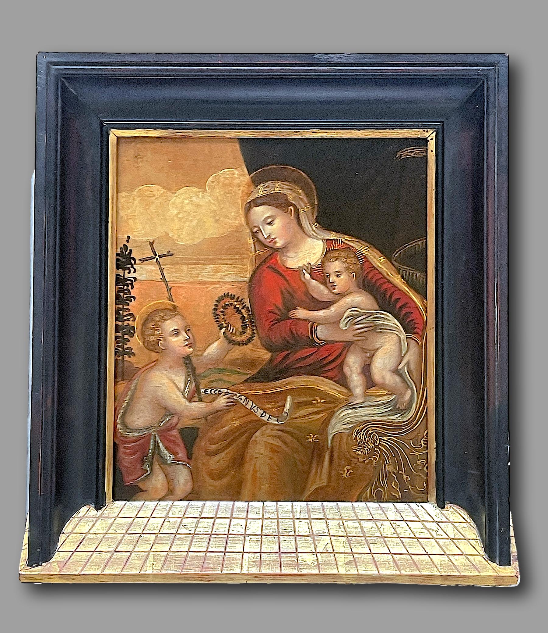 Charmant panneau de dévotion privée représentant la Vierge tenant l’Enfant Jésus, en tendre interaction avec le petit Saint Jean-Baptiste.