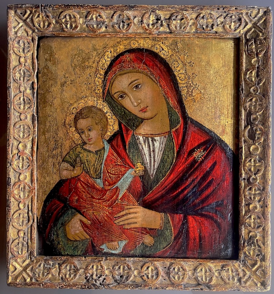 Cette remarquable Oeuvre représente la Vierge Hodigitria, littéralement "celle qui montre le chemin", une typologie iconographique issue du monde byzantin, ici réinterprétée par un atelier d’Italie du Nord, très probablement de la sphère vénéto-crétoise de la fin du XVe ou du début du XVIe siècle. Ce type de représentation, encore profondément ancré dans la tradition byzantine, s’impose alors à Venise comme l’un des motifs dévotionnels les plus populaires, diffusé à travers les routes marchandes de la Méditerranée.